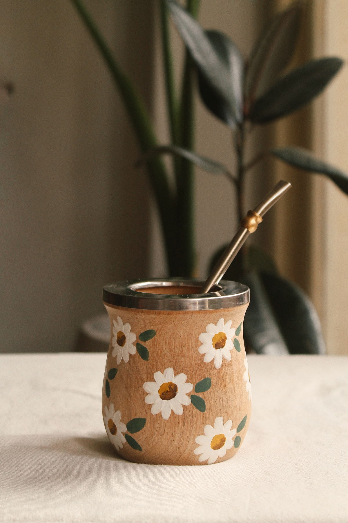 Mate de madera de algarrobo con virola de acero inoxidable, pintado a mano.